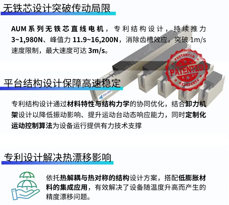 传统滚珠丝杠传动存在间隙且易磨损,不仅导致设备刚性下降、响应延迟,速度还受限(通常≤1m/s);同时反向间隙与惯性问题会直接影响定位精度,难以满足超精密贴装场景需求。