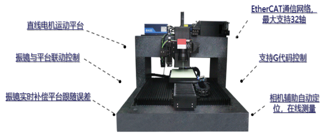 SGS 系统搭载 EtherCAT 总线通信,最大支持 32 轴且可灵活扩展振镜与运动轴数量,适配多轴、多振镜等应用场景;通过振镜实时补偿平台跟随误差,实现高速高精度扫描,搭配优化的轨迹规划算法最大化加工效率。系统支持人机界面软件定制与 G 代码控制,可充分满足大幅面激光精密加工的高效、高精度需求。