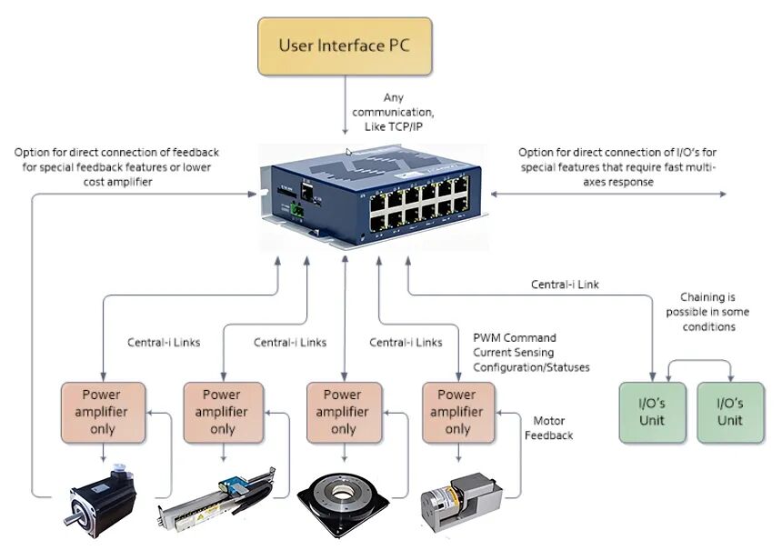 雅科贝思自主研发的AGM800(Century系列)多轴同步控制器,采用独特的Central-i星型总线架构。该设计将核心控制算法集中于主站,驱动单元专注于功率放大,不仅大幅提升了多轴系统的同步精度与实时性,还有效降低了系统整体成本。在开发友好性上,该控制器支持C/C++、C、Python、LabVIEW等多种主流语言,并提供了自研类C语言IDE、无代码编程等四种灵活开发方式,其编程逻辑与ST语言相近,用户通过简单培训即可快速上手,显著缩短了设备集成与工艺研发周期。